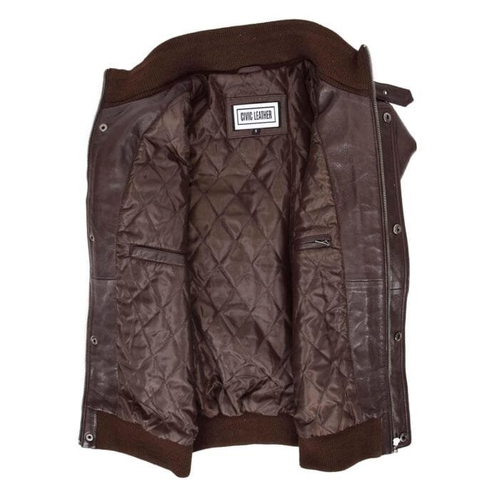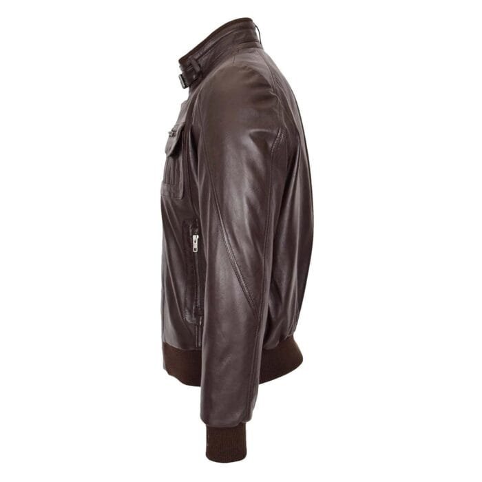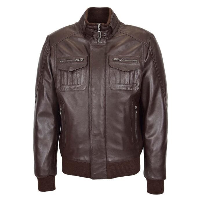 Mens Leather Bomber Flight Jacket Tom Brown is sure to give you an undisputed look. This leather bomber jacket for men amazing fitted style with soft sheep aniline leather to give the wearer a jacket that can be worn with anything. Also, this men’s leather bomber jacket features a popper button fly with YKK zip fastening, buckle at the neckline, and four front pockets. Inside, it is fully lined with polyester.