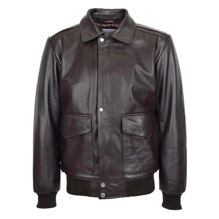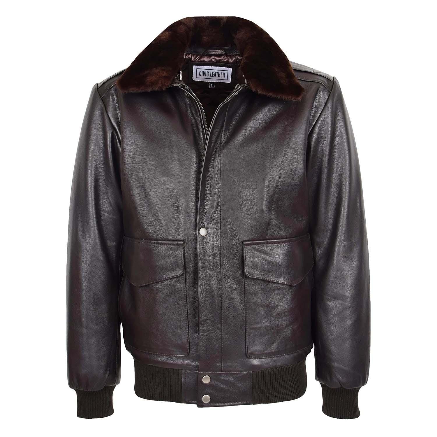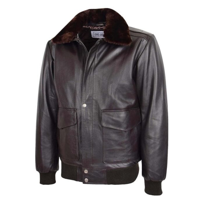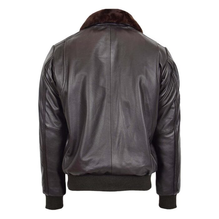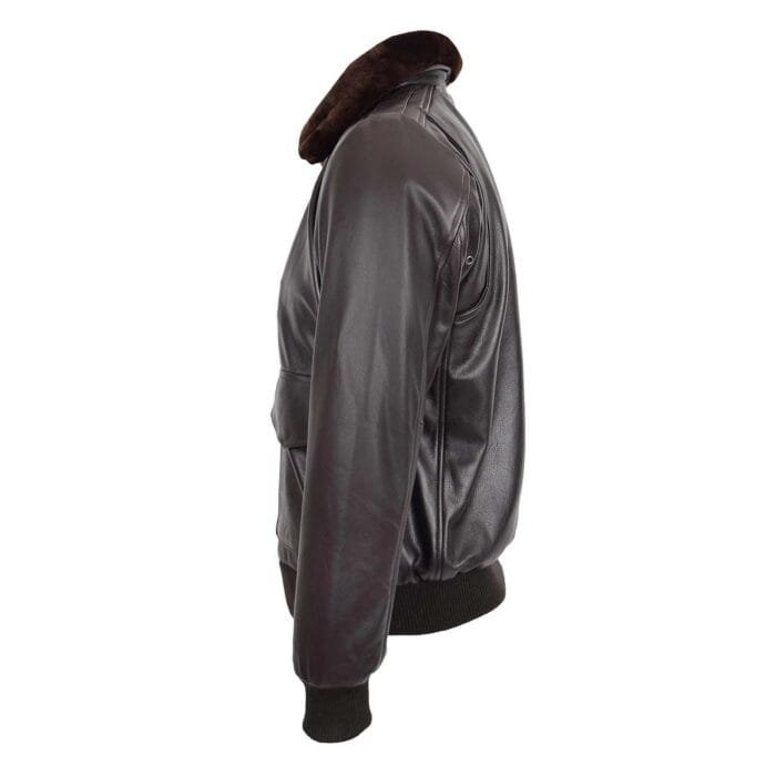 An authentic mens Leather Bomber Jacket G-1 Aviator Style Jarrod Brown. This style of leather bomber jacket for men has all the cues such as heavy duty soft-to-touch cowhide leather, four outer pockets, bi-swing back vents and a detachable sheepskin collar. Inside polyester lining with half of the body in cotton.