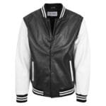 A wonderful Mens Leather College Boy Varsity Jacket Garry Black White made from luxury delicate nappa leather. It highlights a snap button front fastening, two external pockets and rib knit fix and sleeves to protected the body.